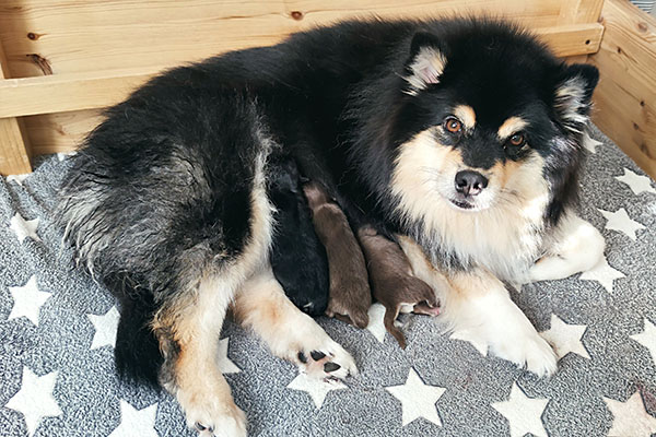Miina synnytti kolme pentua (uroksen ja 2 narttua). Pennut ovat väreiltään mustia vaalein/valkoisin merkein. Kaikki pennut alustavasti varattu.